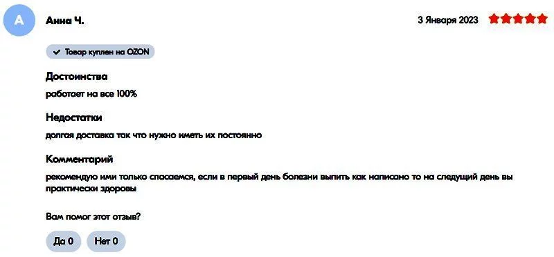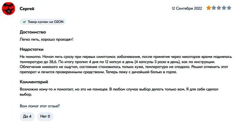 网友“谢尔盖”是前十页评论中唯一认为连花清瘟无效的。他给出了一星评价并表示:“我在出现症状时开始服用,但体温仍然升至38.6度。按照说明书吃了4天,每天12粒(4粒每天3次)后并没有好转。我决定停用并采取其他方法治疗。现在我躺在床上,喉咙剧痛。它可能对很多人有帮助,但并不是万能的。无论如何,选择权在您。我为自己做出了选择。”