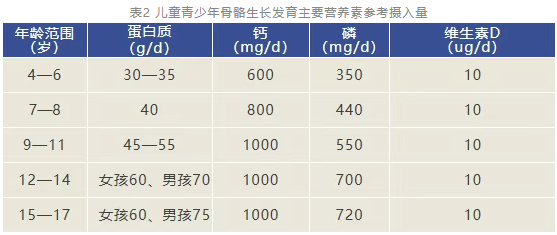 二是注意提供充足营养素。影响儿童青少年骨骼生长发育的主要营养素包括钙、磷、维生素D和蛋白质等,可参考表2为儿童青少年提供充足营养素。